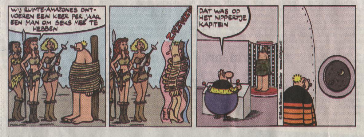 Wij ruimte-amazones ontvoeren een keer per jaar een man om seks mee te hebben. Dat was op het nippertje, kapitein.