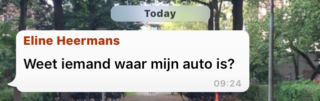 - (download) Eline Heermans SMS Weet iemand waar mijn auto is (cropped).png . . 639 × 203 . . 147 KB . . Tom . . 21:15, 18 January 2018